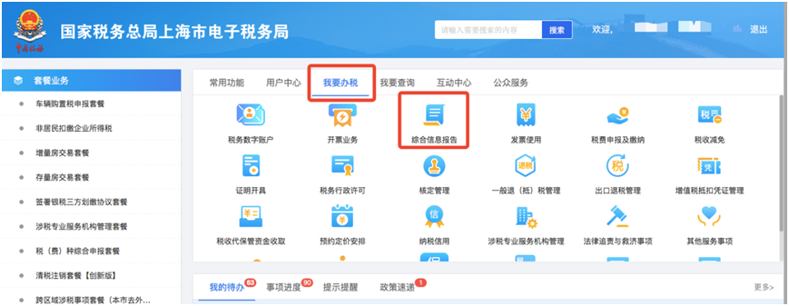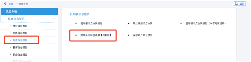 第一步:登录上海市电子税务局,点击【我要办税】—【综合信息报告】—【制度信息报告】—【财务会计制度备案(创新版)】。