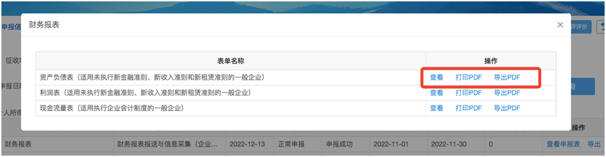 第三步:选择要查询的财务报表,可以查看申报表,也可以打印或导出PDF文件。