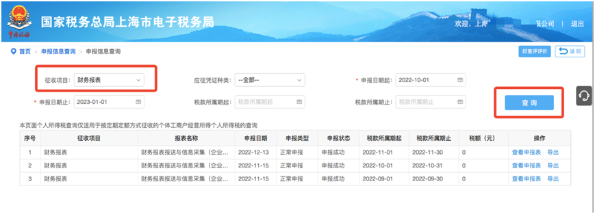 第二步:征收项目选择“财务报表”,筛选申报日期、税款所属期等条件后,点击“查询”。