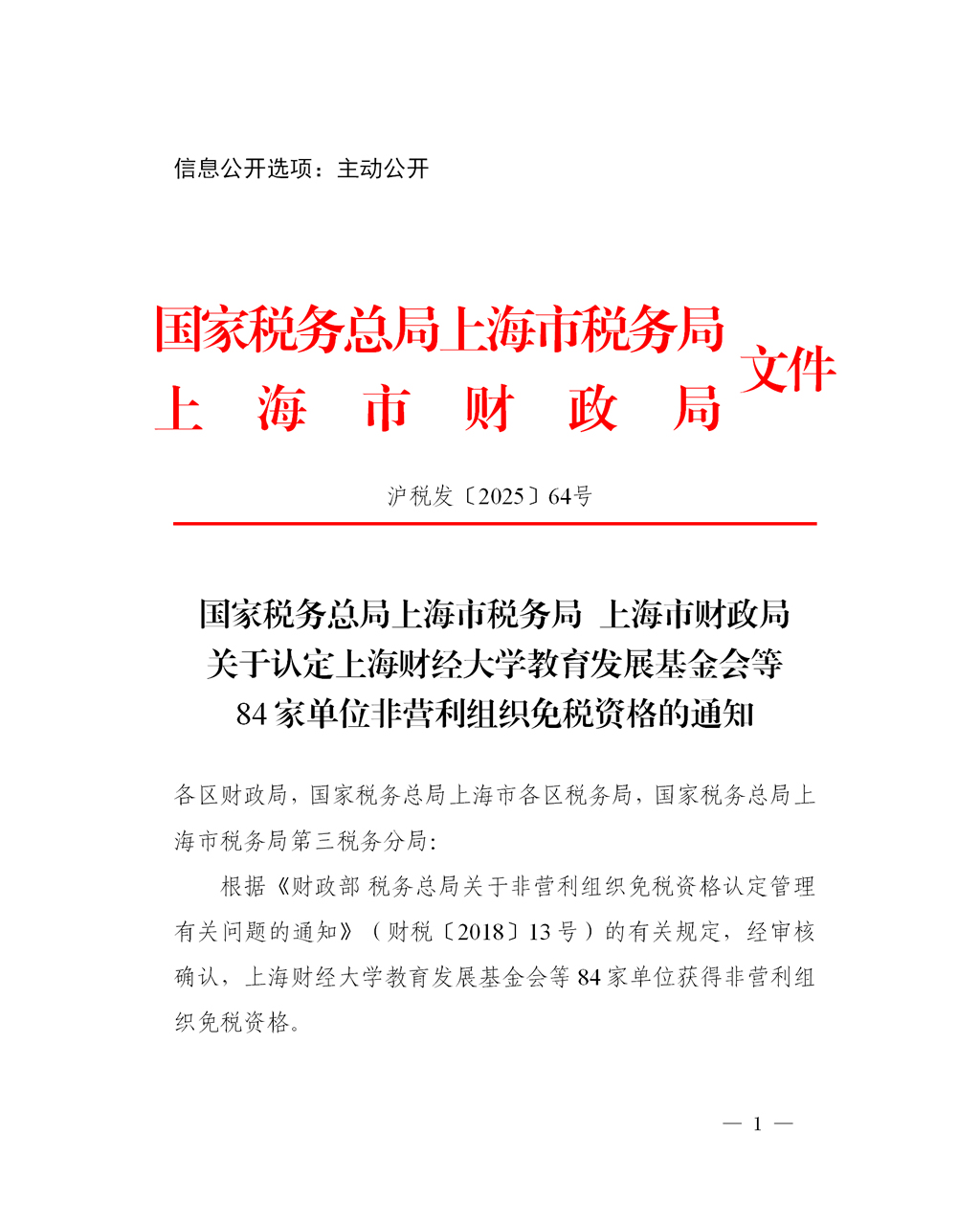 根据《财政部 税务总局关于非营利组织免税资格认定管理有关问题的通知》(财税〔2018〕13号)的有关规定,经审核确认,上海财经大学教育发展基金会等84家单位获得非营利组织免税资格。
